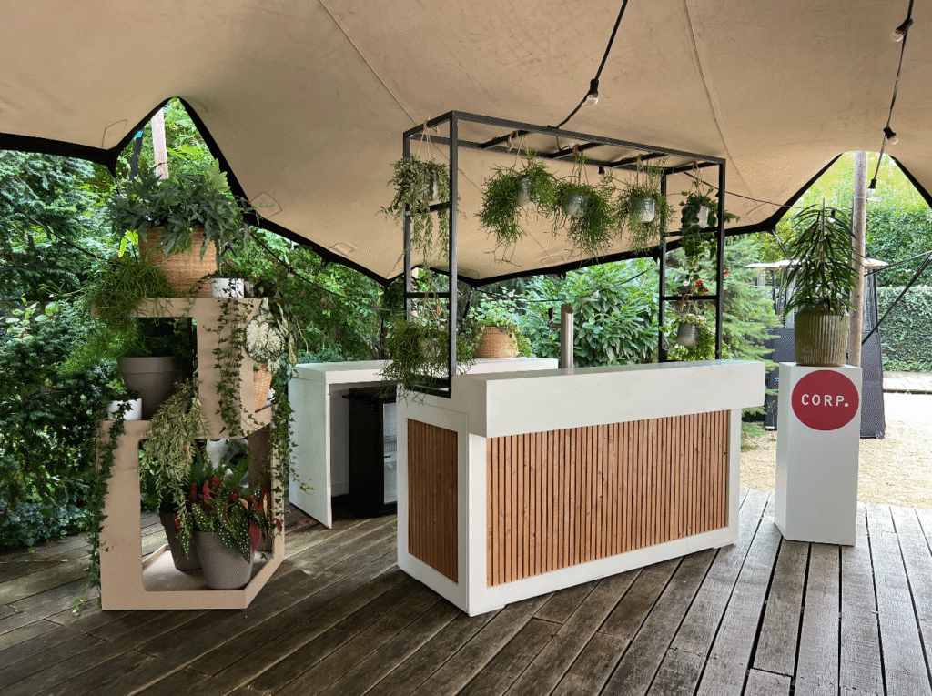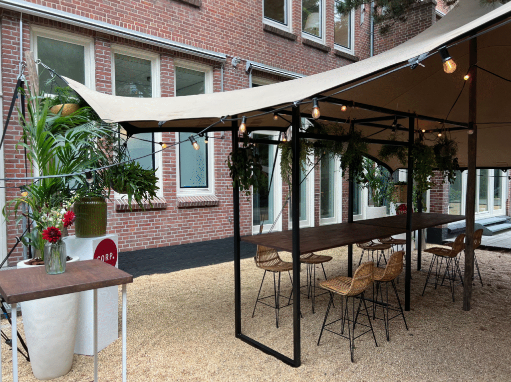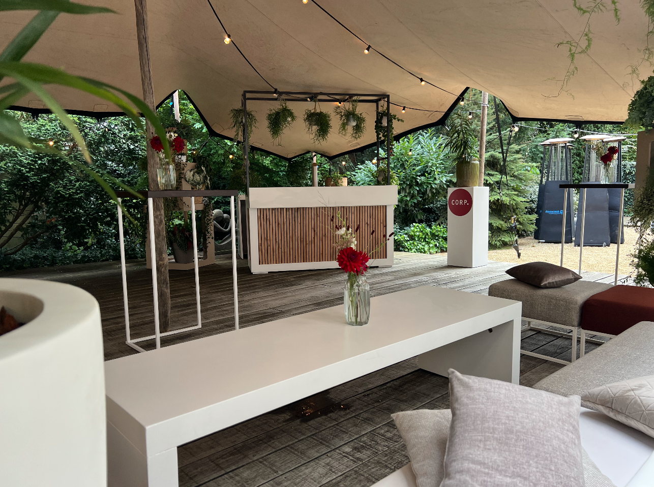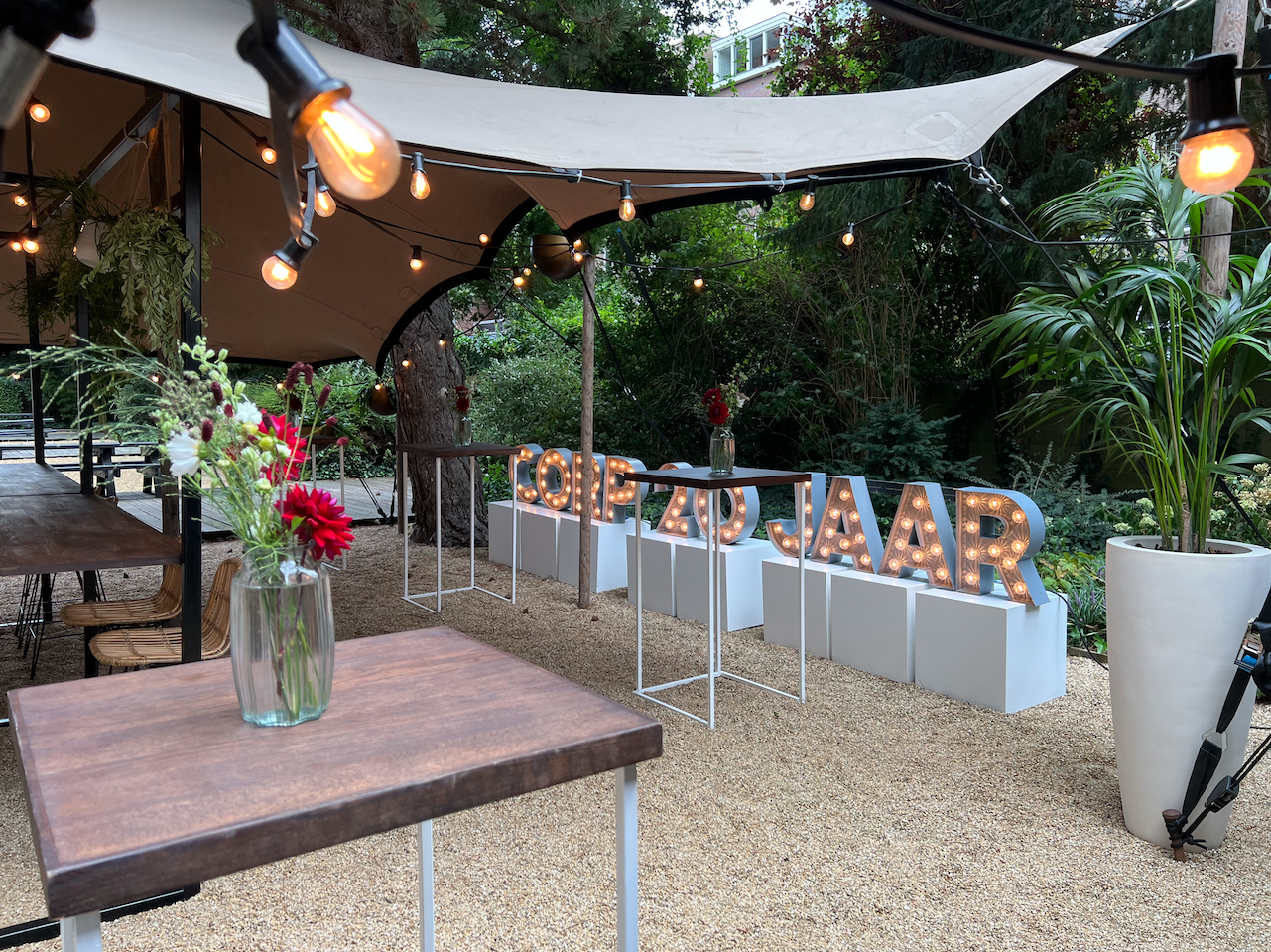 Voor de aankleding van het event creëerden we een mix van hoge en lage meubels, gecombineerd met een schattig barretje met een groene touch. Als eyecatcher plaatsten we verschillende sokkels met lichtletters die het geheel tot leven brachten en een feestelijke uitstraling gaven. De ruimte werd zo een stijlvolle en uitnodigende omgeving voor alle gasten.