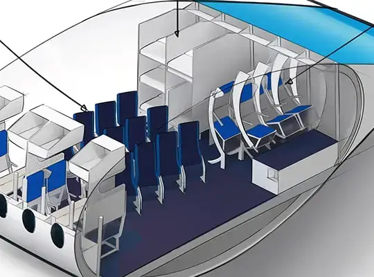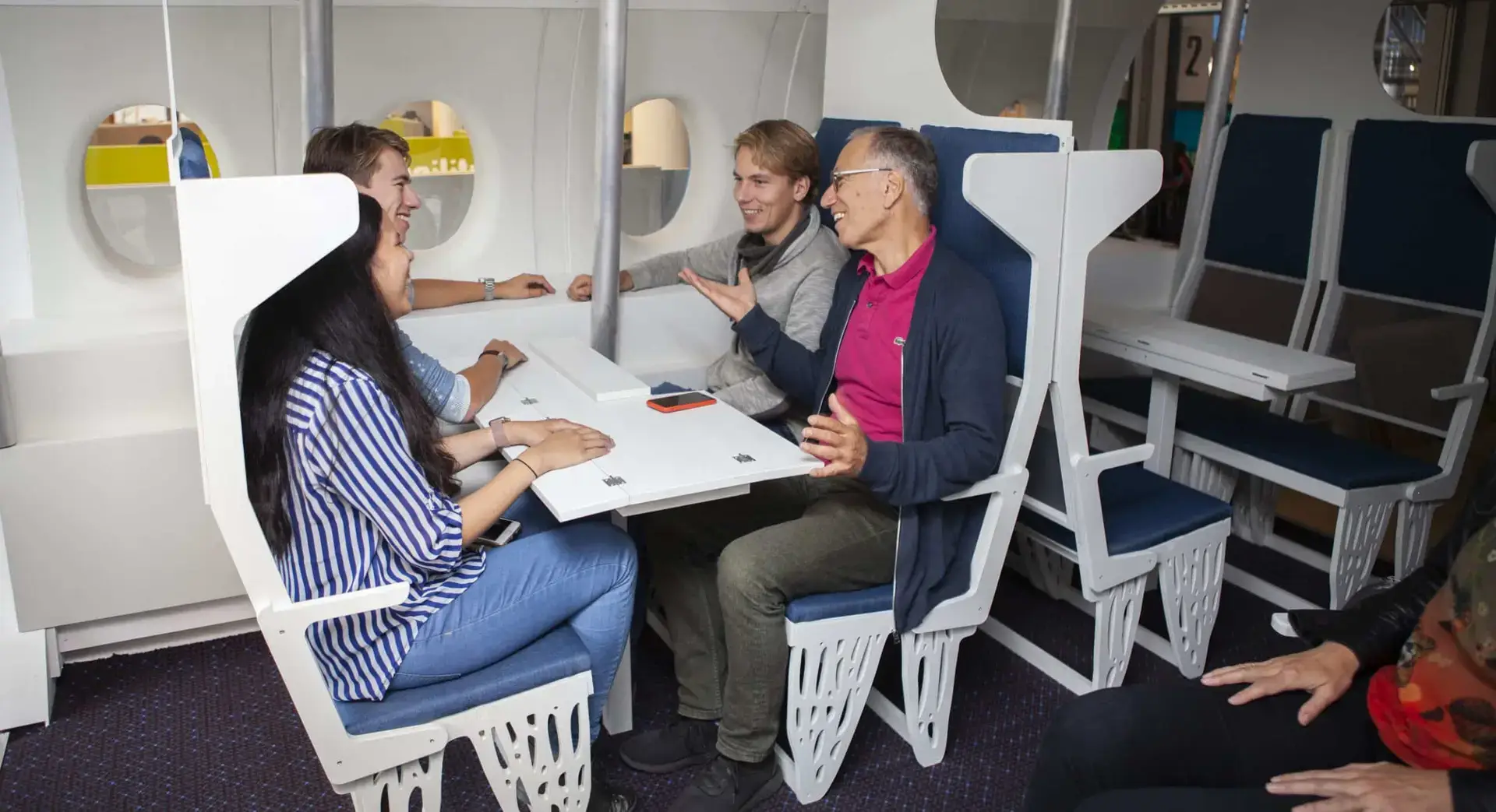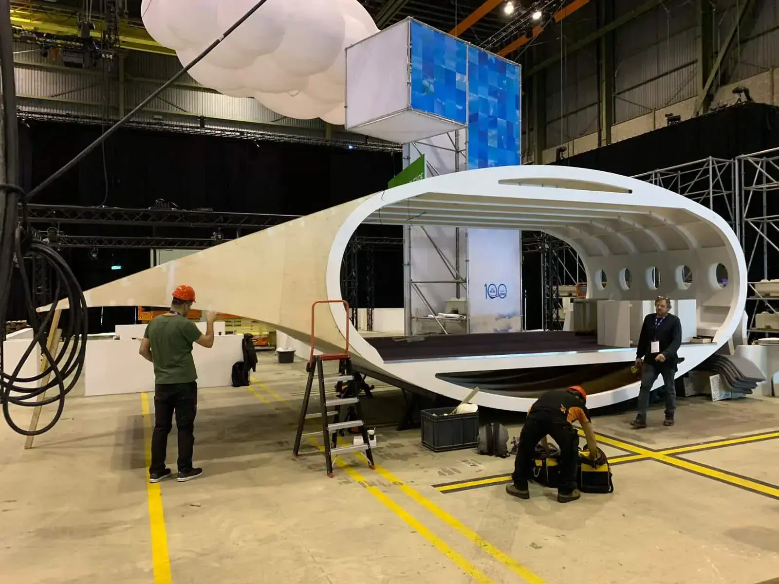 Maar hoe voelt het nu om in deze cabine te zitten? Met deze uitdaging gingen de standbouw specialisten van DCRT aan het werk. Zij bouwden de levensgrote cabine inclusief meubilair op maat! De Flying-V was als  “passagier van de toekomst” even te bewonderen en ervaren. Bezoekers konden de cabine van dichtbij bekijken, compleet met slimme stoelindelingen. Door het ontwerp van DCRT konden ze niet alleen zien hoe de toekomst van vliegen eruitziet, maar ook daadwerkelijk voelen hoe het zou zijn om er in te zitten. De ervaring was een tastbare manier om te begrijpen hoe TU Delft’s visionaire concepten in de praktijk zouden kunnen werken.