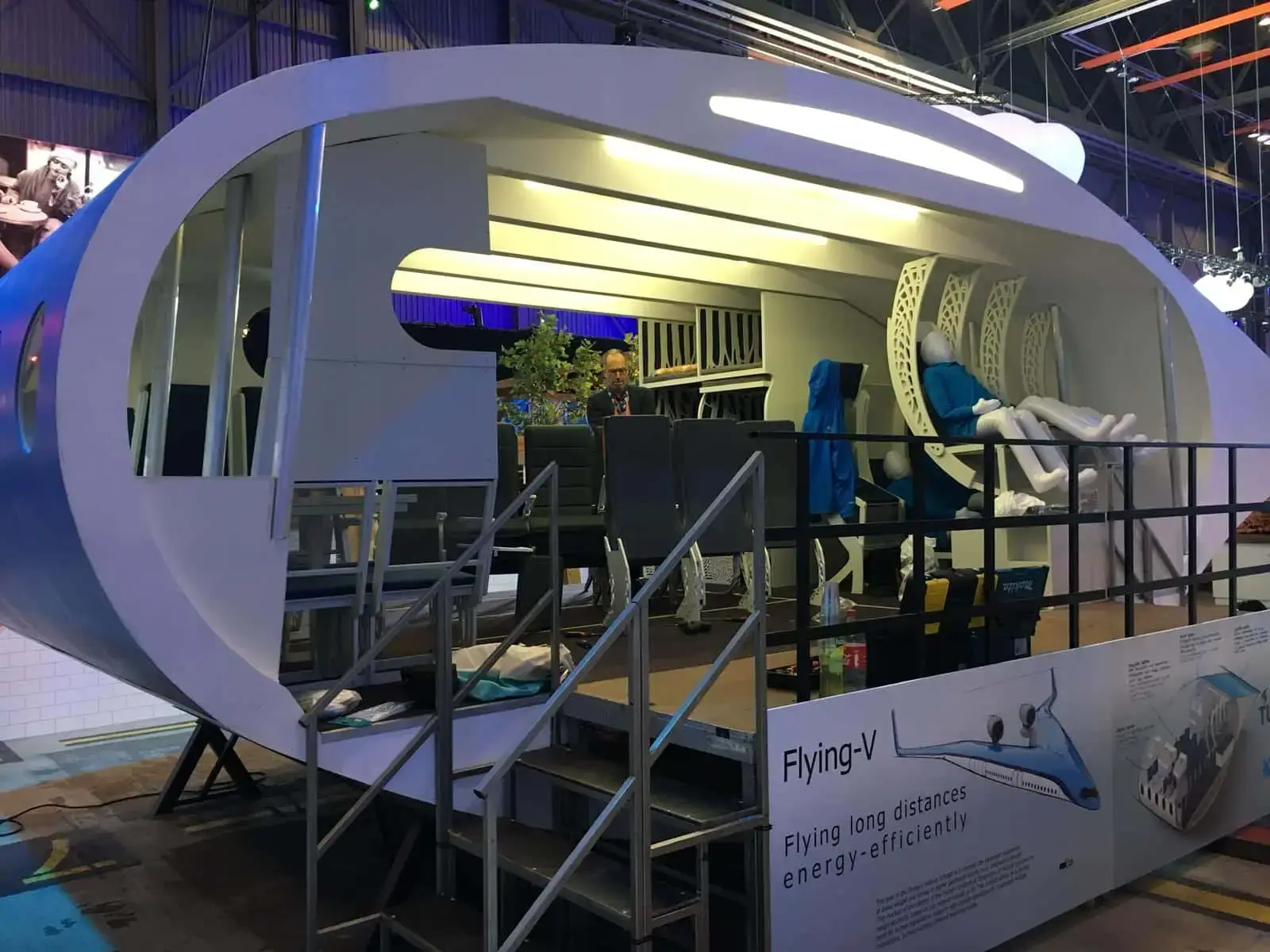 Van design tot een levensgroot model: de cabine van de Flying V werd tastbaar in het jaar dat KLM haar 100-jarig jubileum vierde. De Flying-V is zoals de naam al doet vermoeden een grote vliegende V. Dit vliegtuigontwerp van de toekomst is zeer aerodynamisch, zal een lager gewicht hebben en daarmee minder brandstof verbruiken. Ook het interieur is slim uitgedacht met bedmodules, stoelen die tegenover elkaar zijn geplaatst voor groepsreizigers en zelfs een chaise longue voor ultiem comfort.