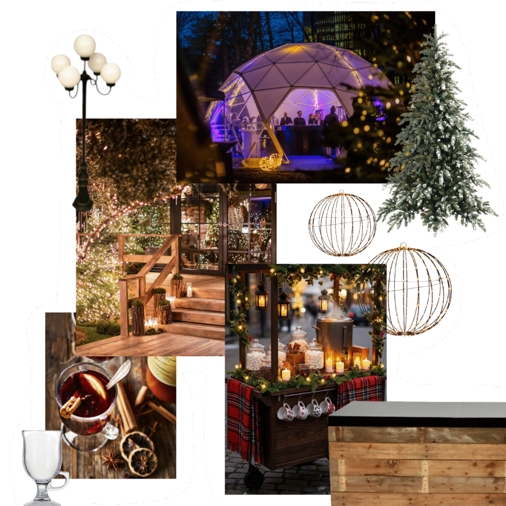 Groen, wit en glinsterende details vormen een harmonieus geheel dat rust en luxe uitstraalt. Sfeervolle verlichting en glühwein zorgen voor een warme, verfijnde sfeer waarin elk element tot zijn recht komt.